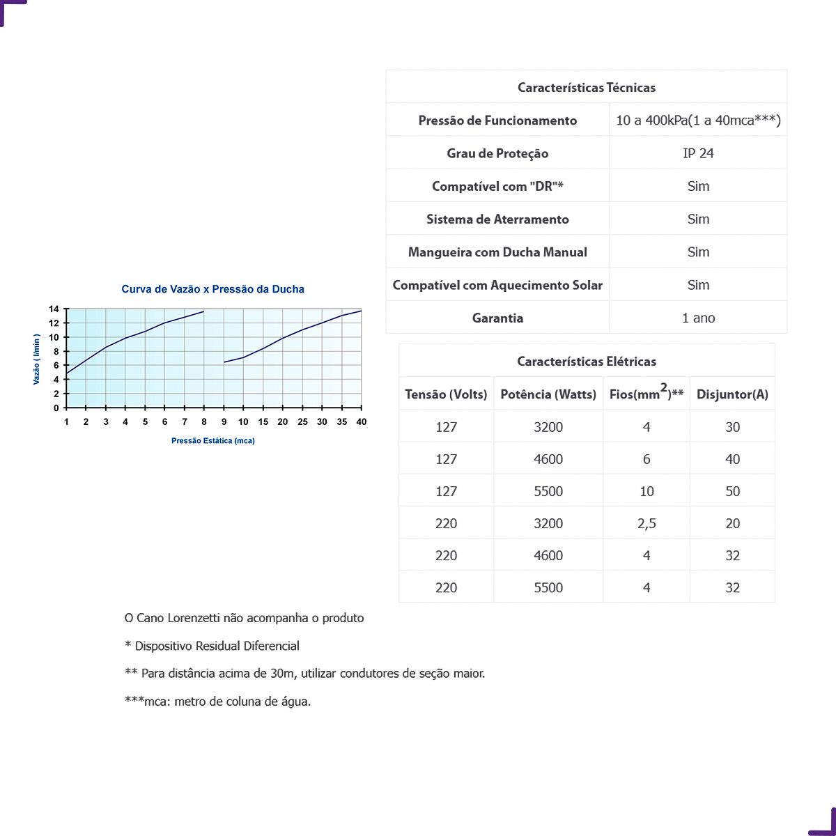 Atenção: Certifique-se das especificações de Tensão e Potência adequadas ao local de uso. As especificações deste produto estão contidas no título do anúncio. Este modelo não acompanha cano para instalação