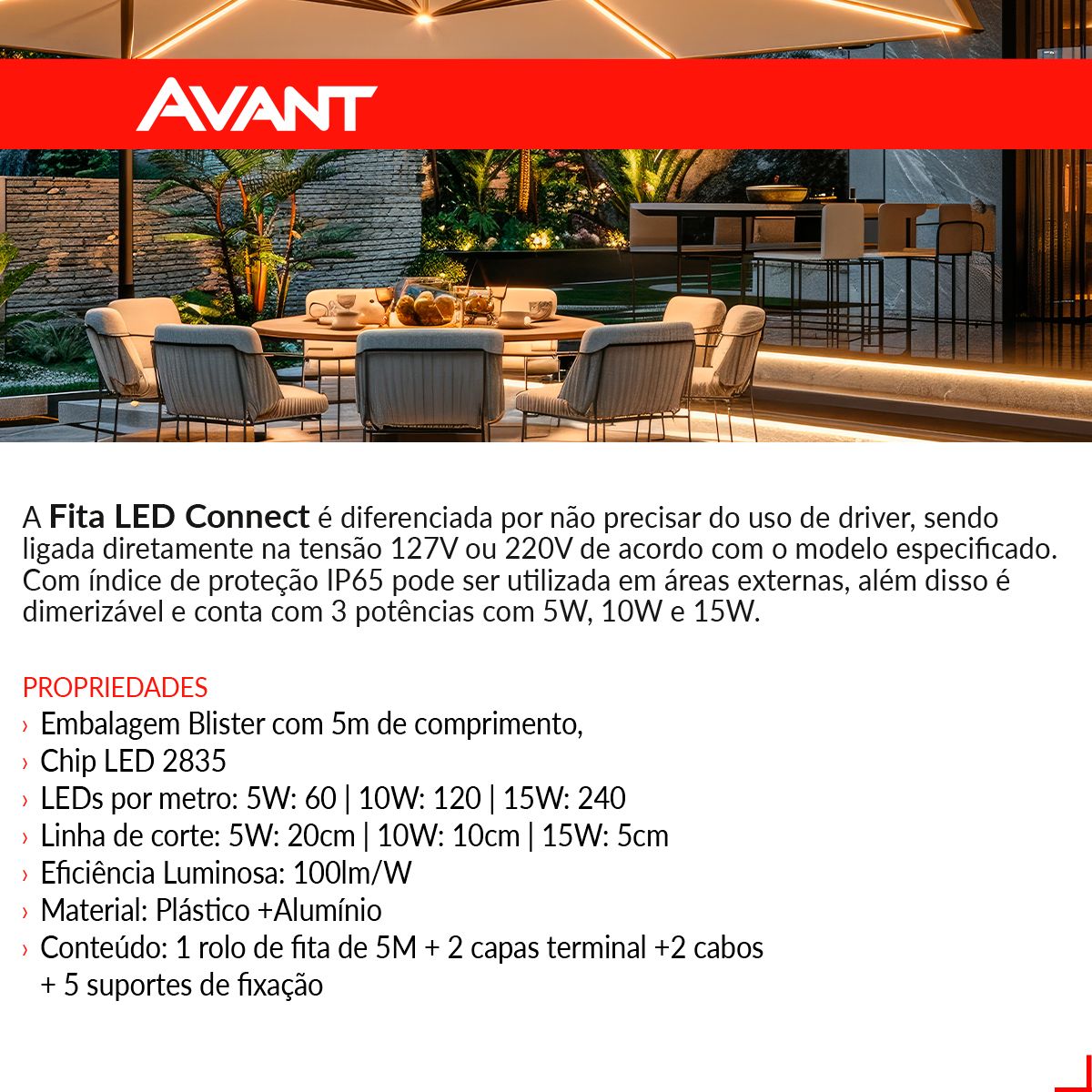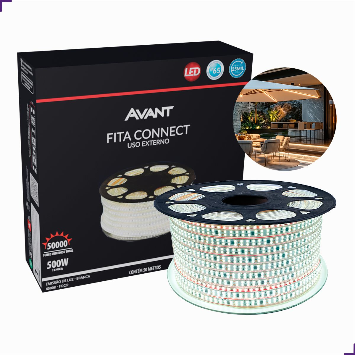 Ilumine seus projetos com a Fita Led Connect 10w 50m 127v da Avant! Ideal para ambientes internos e externos, esta fita LED oferece alta performance, praticidade e economia de energia.